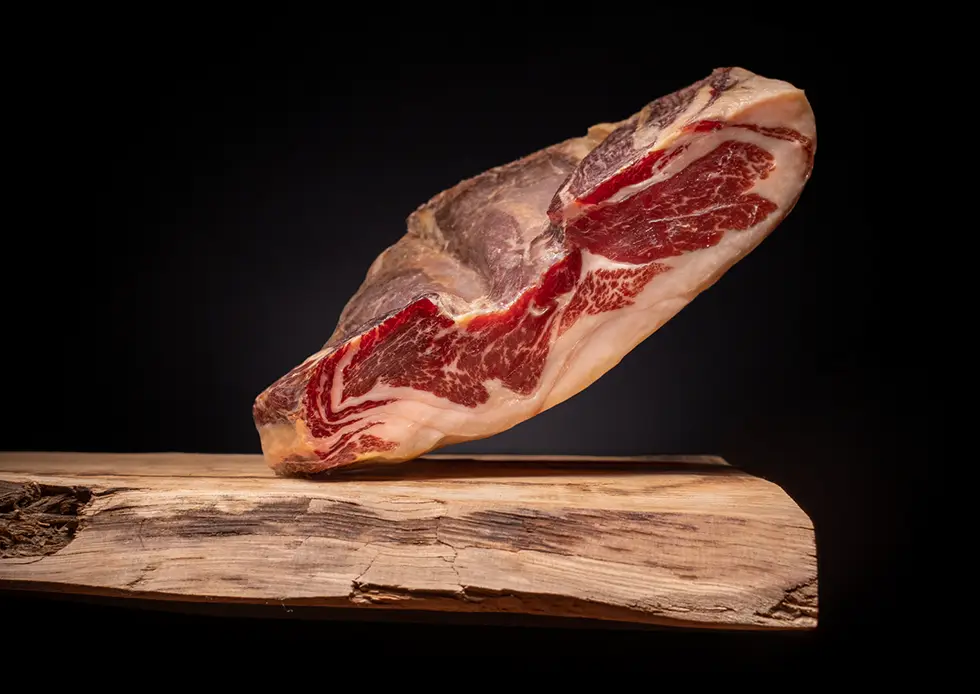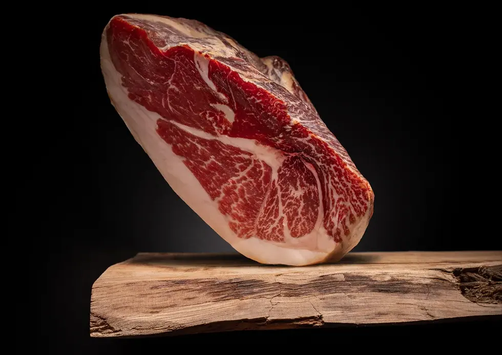 Seleccionamos cuidadosamente piezas de cerdo de la mejor calidad, siguiendo un proceso tradicional de salado y curación lenta que respeta los tiempos de la naturaleza. Cada jamón se mima en todas sus fases, desde la elección de la materia prima hasta conseguir el punto óptimo de curación.